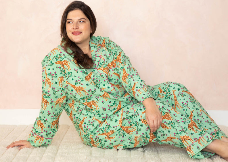 A pattern that reaches new heights to give you the sweetest of dreams, Grazing Giraffes will satisfy your leafy appetite for cute sleepwear. Straight from the safari and endlessly requested, our Giraffe printed pajamas showcases our favorite gentle giants relaxing in high places.