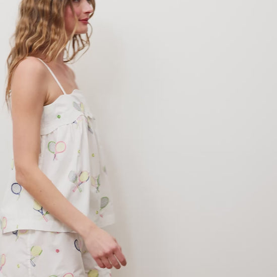 Tennis whites have a new meaning with our embroidered Rosie Set. This short pajama set features embroidered tennis rackets, complete with a scalloped top and an empire waist silhouette. The breezy white pajama shorts are mid-rise shorts with pockets. Charming cotton pajamas are ideal for post-game lounging. Explore more pajama sets, short sleep sets, and spring pajamas.